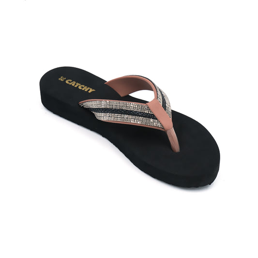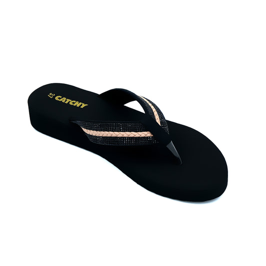 The Catchy Women's Glitter-Strap Wedge Flip-Flop combines expert craftsmanship and comfort, featuring an EVA insole and outsole for lightweight cushioning and reliable durability. The upper is crafted from fabric embellished with stones, delivering a refined sparkle that enhances any outfit. A fabric liner adds breathability and softness, ensuring comfortable wear...